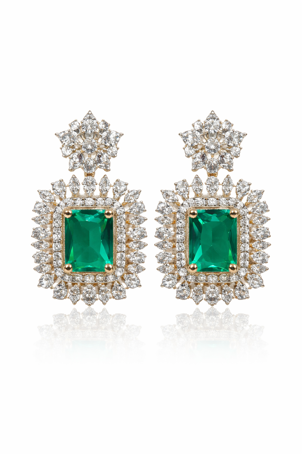 Materials: Silver-plated base metal, adorned with high-quality American Diamonds (AD) and a prominent, vibrant green central stone.