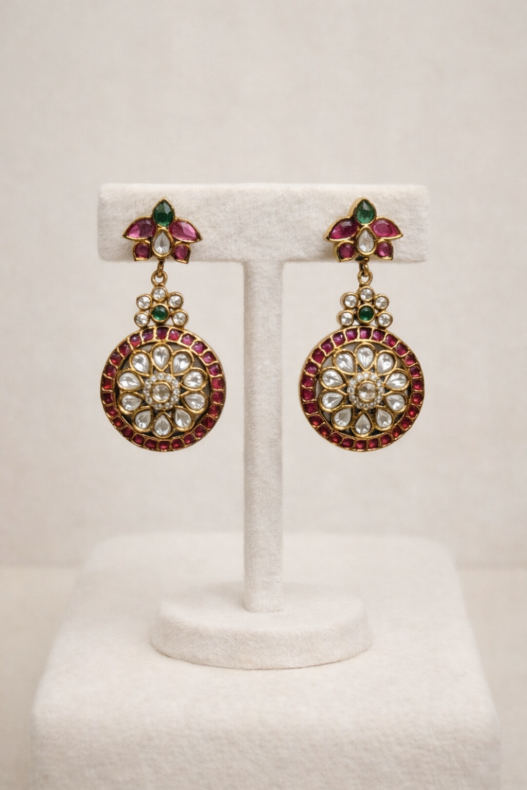 Stones: Adorned with radiant red (ruby/kemp) and green stones, along with white Kundan or AD stones, set by skilled artisans.