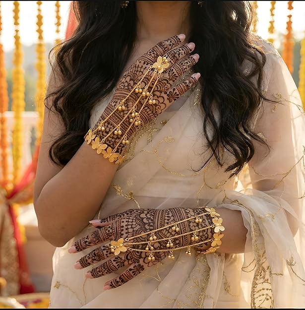 Crafted in a radiant gold finish, this graceful hand harness features beautifully detailed butterfly motifs connected by fine cascading chains and tiny ghungroo-style drops that shimmer with every movement.