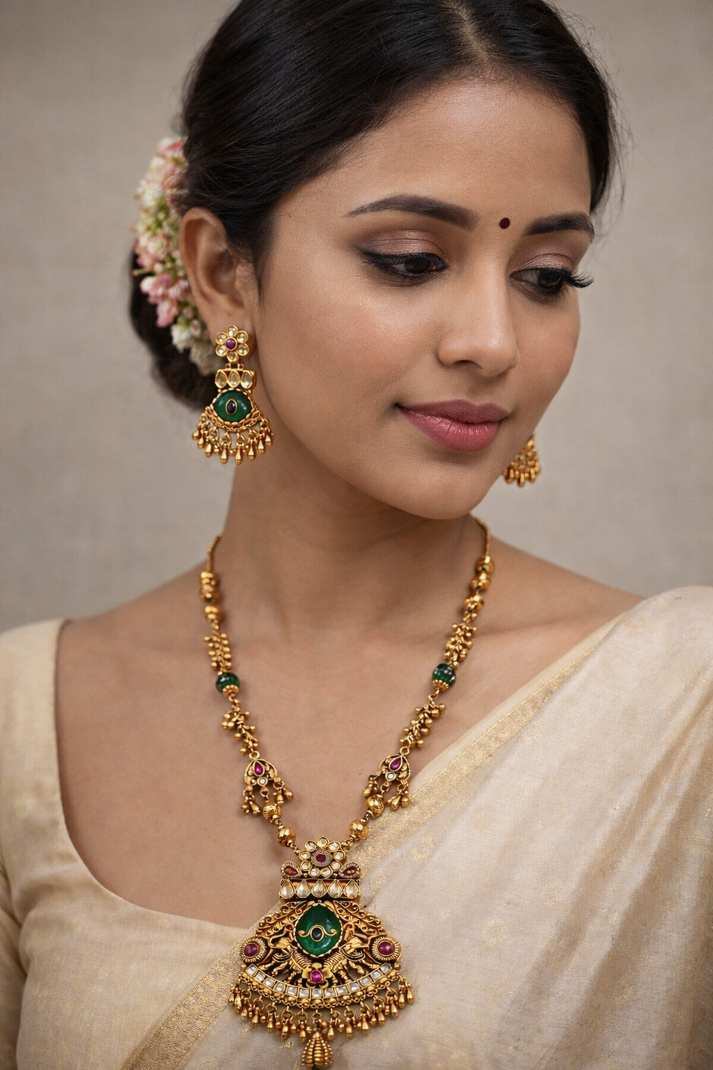 Elevate your traditional jewelry collection with this exquisite gold-toned necklace and earring set, crafted with an antique finish that whispers old-world charm. This stunning set features intricate detailing, studded with vibrant green and ruby-pink stones for a touch of elegance and color.