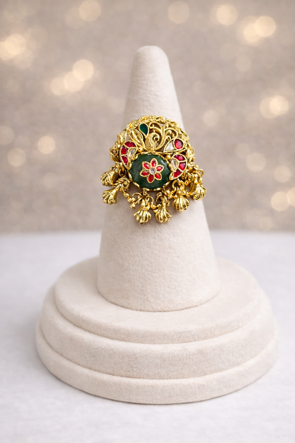 : This opulent cocktail ring features a central circular "Chand" (crescent) motif in deep emerald-green, adorned with a delicate red floral floret. Flanking this are two sculptural peacock figures set in an intricate antique gold frame, accented with sparkling white Kundan glass and ruby-red stone details. The design is elegantly finished with a series of dangling golden ghungroo (bell-like) charms, adding movement and a vintage royal charm to the overall look.