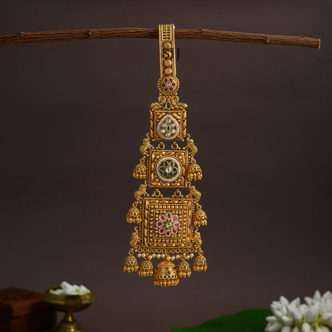 - Design and Style: The accessory has an antique gold-look finish and features three square-shaped motifs. These motifs are embellished with kundan stones, including green, white, and pink accents, and small pearl drops dangle from the bottom.