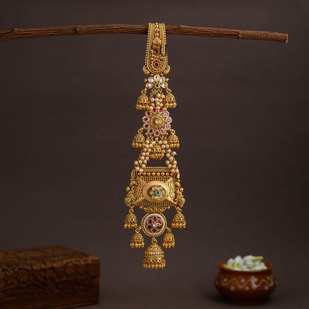 - Design and Style: The accessory has an antique gold-look finish and features three square-shaped motifs. These motifs are embellished with kundan stones, including green, white, and pink accents, and small pearl drops dangle from the bottom.